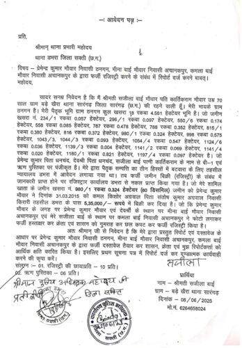 श्रीमती सजीला बाई ने थाने में दर्ज शिकायत में बताया कि उनकी ग्राम ठनगन स्थित कुल 18 रकबा यानी लगभग 4.581 हेक्टेयर भूमि जो प्रमेन्द्र कुमार पिता धनचंद, देवश्री पिता धनचंद एवं स्वयं सजीला बाई पत्नी कार्तिकराम के नाम पर बी1 एवं ऋण पुस्तिका में दर्ज है। जिसका तीन हिस्से में बटवारा करने तहसील कार्यालय डभरा में आवेदन लगाया तब उन्हे पता चला कि उनके जमीन खसरा नंबर 980/1 में से 0.324 हेक्टेयर जमीन को बिना उनकी जानकारी और सहमति के, फर्जी हस्ताक्षर और कूट रचित दस्तावेजों के आधार पर बेचा गया। 31 मार्च 2015 को खरीददार कमल किशोर अग्रवाल पिता संतोष कुमार अग्रवाल निवासी किरारी के पास बेचने वालों में प्रमेन्द्र कुमार मौवार, मीना बाई मौवार और कमला बाई के नाम सामने आए हैं, जिन्होंने रजिस्ट्री कार्यालय में खुद को वारिस दिखाकर रजिस्ट्री करवा दी। पीड़िता का आरोप है कि फर्जी फोटो लगाकर और जाली पहचान-पत्रों के आधार पर यह खेल खेला गया, और रजिस्ट्री पूरी कर दी गई।