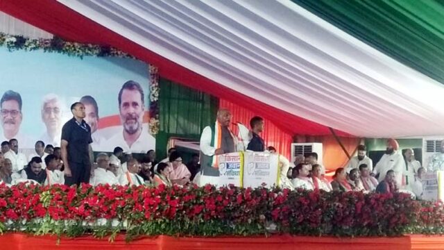 जवान ,किसान,और संविधान जन सभा मे कांग्रेस के राष्ट्रीय अध्य्क्ष मल्लिकार्जुन खड़गे ने कहा कि बी.जे.पी. देश मे भय और झूठ की राजनीति कर रही है ।