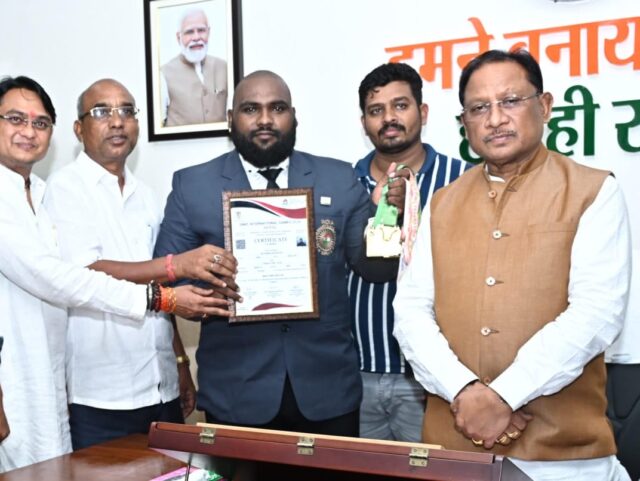 रायपुर 12 जुलाई 2025/ मुख्यमंत्री श्री विष्णु देव साय से रायपुर स्थित मुख्यमंत्री निवास कार्यालय में एसबीकेएफ इंटरनेशनल गेम्स 2024 में स्वर्ण पदक विजेता पावरलिफ्टर श्री प्रेम राजन रौतिया ने सौजन्य मुलाकात की। मुख्यमंत्री श्री साय ने उन्हें इस विशिष्ट उपलब्धि पर हार्दिक बधाई देते हुए कहा कि छत्तीसगढ़ के युवा आज अंतरराष्ट्रीय मंचों पर देश और प्रदेश का नाम रोशन कर रहे हैं, जो हम सभी के लिए गर्व का विषय है।