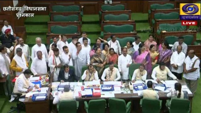 विधानसभा के मानसून सत्र के तीसरे दिन खाद संकट पर विपक्ष ने कृषि मंत्री रामविचार नेताम को घेरा. मंत्री के जवाब से असंतुष्ट विपक्षी दल के सदस्यों ने पहले गर्भगृह में पहुंचकर ‘खाद की कालाबाजारी बंद करो’ जैसे नारे लगाए, इसके बाद सदन से वॉकआउट किया.