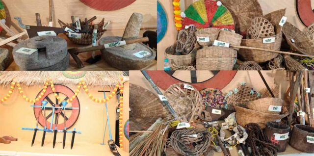 सबसे बाईं ओर दो गोलनुमा लकड़ी की संरचनाएँ रखी गई थीं, जिन्हें ‘काठा’ कहा जाता है। पुराने समय में जब गाँवों में धान तौलने के लिए काँटा-बाँट प्रचलन में नहीं था, तब काठा से ही धान मापा जाता था। सामान्यतः एक काठा में लगभग चार किलो धान आता है। काठा से ही धान नाप कर मजदूरी के रूप में भुगतान किया जाता था।