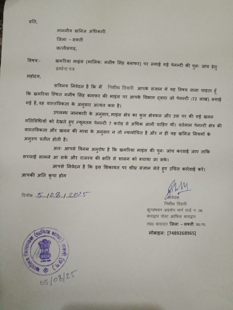 खनिज विभाग की ढिलाई और मिलीभगत ने एक बार फिर सरकारी तंत्र की कार्यशैली पर गंभीर सवाल खड़े कर दिए हैं। खम्हरिया माइंस मालिक मनीष सिंह बनाफर के माइंस पर चल रहे अवैध खनन की शिकायत पर महीनों गुजर जाने के बाद भी विभागीय अधिकारियों द्वारा कार्रवाई तक नहीं की गई। इससे आक्रोशित शिकायतकर्ता निशीथ तिवारी ने कहा अब सीधे सक्ती कलेक्टर के जनदर्शन में आवेदन देकर उच्चस्तरीय जांच की मांग करने की तैयारी है।