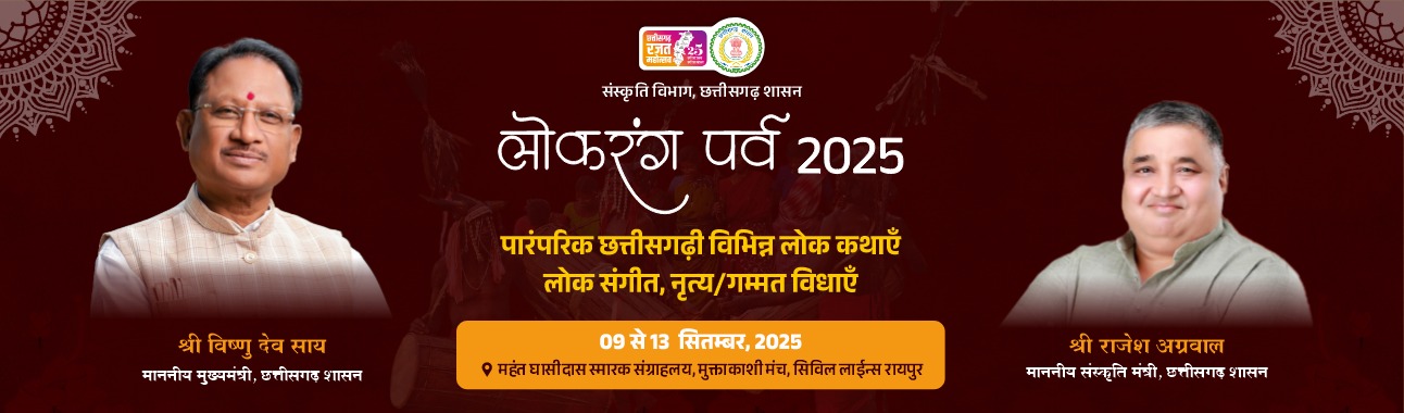 रायपुर: संस्कृति विभाग, छत्तीसगढ़ शासन द्वारा लोक रंग पर्व 2025 का आयोजन 9 से 13 सितम्बर तक राजधानी रायपुर के महंत घासीदास स्मारक संग्रहालय स्थित मुक्ताकाशी मंच, सिविल लाइन्स में किया जा रहा है।