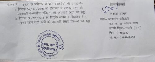 सूचना का अधिकार अधिनियम 2005 के तहत मांगी गई जानकारी में इस बात का खुलासा हुआ है, कि एक ही व्यक्ति को दो बार सितंबर 2015 और दिसंबर 2015 में वो भी लगभग तीन माह के बाद पुनः अनुकंपा नियुक्ति देकर फर्जीवाडें को अंजाम दिया गया। वही जिम्मेदारों ने इस को अंजाम देने गजब का खेल खेला है, सूचना का अधिकार में प्राप्त दस्जावों में विभाग ने स्वयं स्वीकार किया है कि सितंबर 2015 में उक्त व्यक्ति को भृत्य (चतुर्थ श्रेणी) के पद पर अनुकंपा नियुक्ति दी गई थी। और उन्होने बकायदा ज्वाईन भी किया है। वहीं साक्ष्य छुपाने भृत्य पद पर नियुक्ति से जुड़े मूल दस्तावेज़ जिला कलेक्टर कार्यालय में जमा हैं, वही जिस रजिस्टर में पदभार ग्रहण करने उल्लेख है उसकी छायाप्रति उपलब्ध कराया गया है। वही दिसंबर 2015 में ग्रेड 03 की अनुकंपा नियुक्ति से संबंधित समस्त दस्तावेज उपलब्ध है, यानी रिकॉर्ड छिपाने और गड़बड़ी पर पर्दा डालने की कोशिश साफ झलकती है।