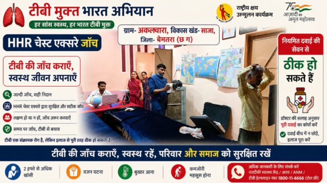 100 दिवसीय टीबी मुक्त भारत अभियान तहत 25 अप्रैल को राष्ट्रीय क्षय उन्मूलन कार्यक्रम जिला बेमेतरा द्वारा कलेक्टर सुश्री प्रतिष्ठा ममगाई के निर्देश पर सीएमएचओ डॉ अमृत लाल रोहलेडर के मार्गदर्शन में 100 दिवसीय टीबी मुक्त भारत अभियान को सफल बनाने में अत्याधुनिक हैंड हेल्ड पोर्टेबल एक्स-रे मशीन के माध्यम से साजा विकासखण्ड के देवकर एवं अकलवारा में शिविर आयोजित कर उच्च जोखिम समूहों का पहचान किया गया इस उच्चजोखिम समूह से 271 लोगों का अत्याधुनिक हैंड हेल्ड पोर्टेबल एक्स-रे मशीन से निःशुल्क एक्स-रे किया गया, तथा 33 लोगों का जो संदेहास्पद था उनका स्पूटम अत्याधुनिक ट्रू – नाट मशीन से जांच हेतु सैंपल कलेक्शन कराया गया । इस टी बी मुक्त भारत अभियान शिविर में साजा विकासखण्ड के स्वास्थ्य विभाग से सभी स्टाफ, मितानिन , द्वारा पूर्व से ही लोगों को टीबी मुक्त बेमेतरा जिला के अभियान की संपूर्ण जानकारी घर-घर सर्वे कर दी गई एवं जनजागरूकता अभियान भी चलाया गया । उक्त शिविर में बीएमओ साजा ,जिला कार्यक्रम समन्वयक, बी पी एम,एस टी एस,,द्वारा पूरी जिम्मेदारी से शिविर में सहभागिता निभाई गई ,साथ में जिला चिकित्सालय बेमेतरा से रेडियोग्राफर शेष नारायण टंडन द्वारा अत्याधुनिक हैंड हेल्ड पोर्टेबल एक्स-रे मशीन ऑपरेट किया गया, ग्रामीण स्वास्थ संयोजक देवकर एवं अकलवारा उच्च जोखिम ग्राम मितानिन एवं ग्रामीण जन अधिक संख्या में उत्साहित होकर उपस्थित रहें,शिविर में स्वास्थ्य विभाग टीम द्वारा कार्यो का सफल क्रियान्वयन किया गया ।